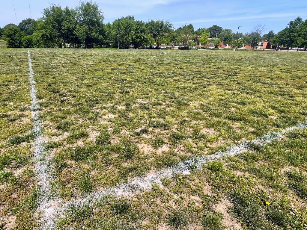 The state paid for upgrades at Bates, but the school system installed a grass field instead of more durable turf, citing cost and environmental concerns. The worn dirt space is closed for reseeding.